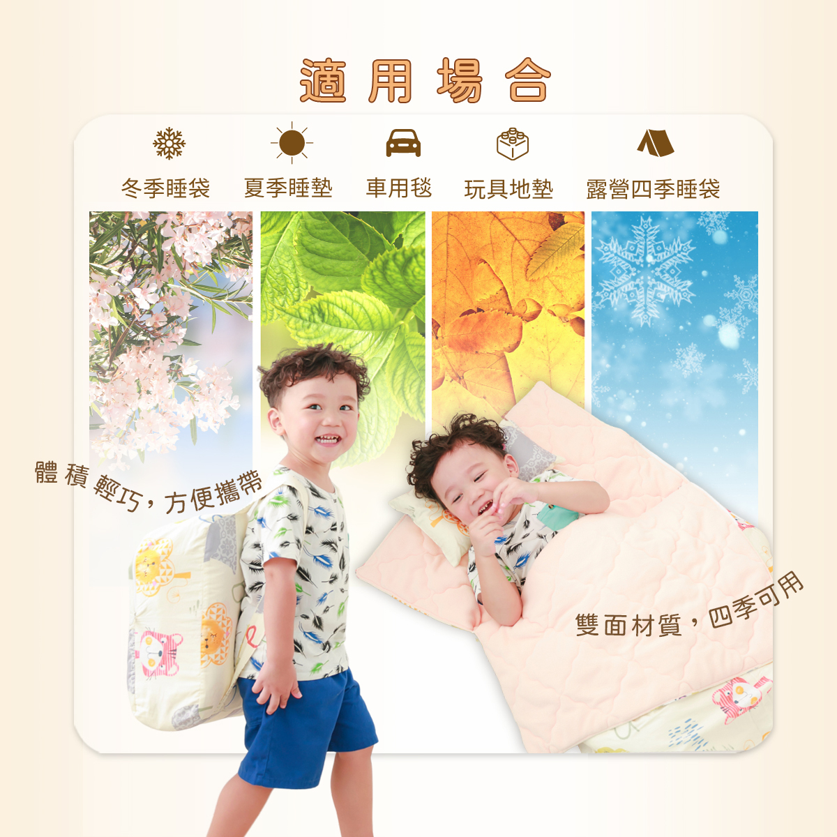 睡袋使用季節:印花面夏天適用(涼感),刷毛面冬天適用(溫感)