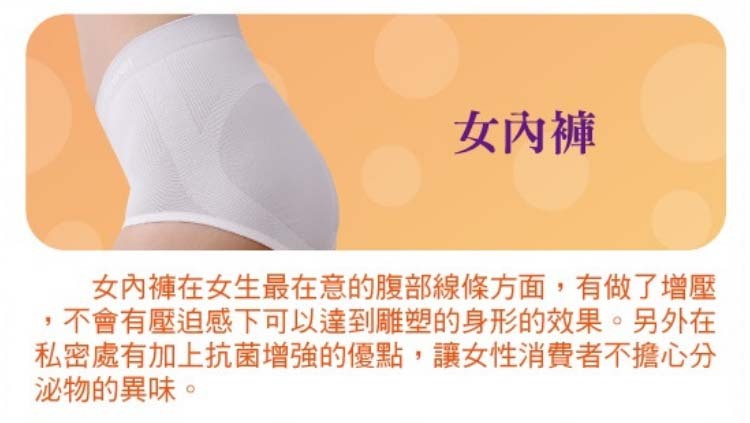 女內褲在女生最在意的腹部線條方面,做了增壓設計,在不會有壓迫感下可以達到雕塑的身形的效果,另外在私密處有加上抗菌增強的優點,讓女性消費者不擔心分泌物的異味。